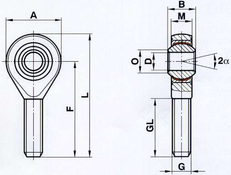 | Size (D H7) | B | M | A | F | L | O | G | GL | Static load C0 kN | Dynamic load C kN | Limiting speed rev/min | Pivoting angle α (o) | Weight (g) |