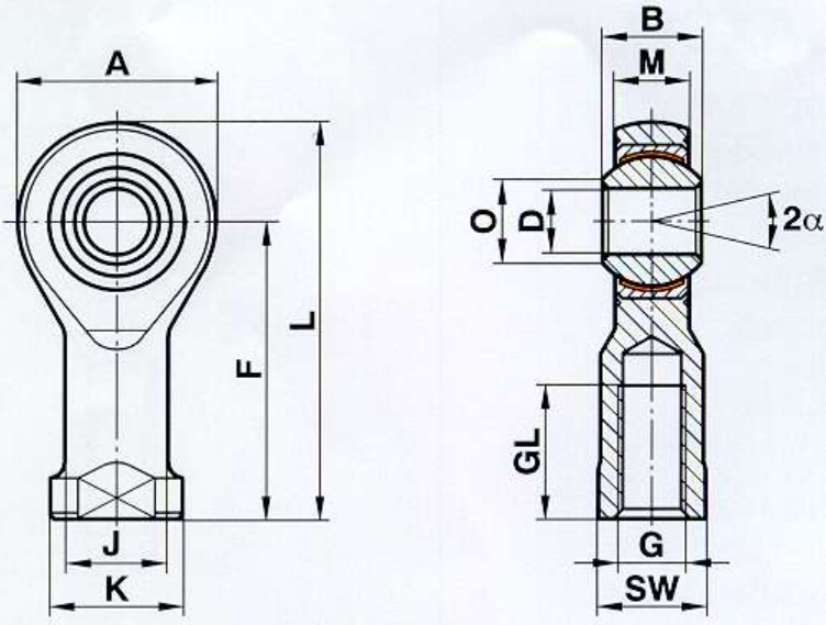 | Size (D H7) | B | M | A | F | L | K | J | O | SW | G | GL | Static load C0 kN | Dynamic load C kN | Limiting speed rev/min | Pivoting angle α (o) | Weight (g) |