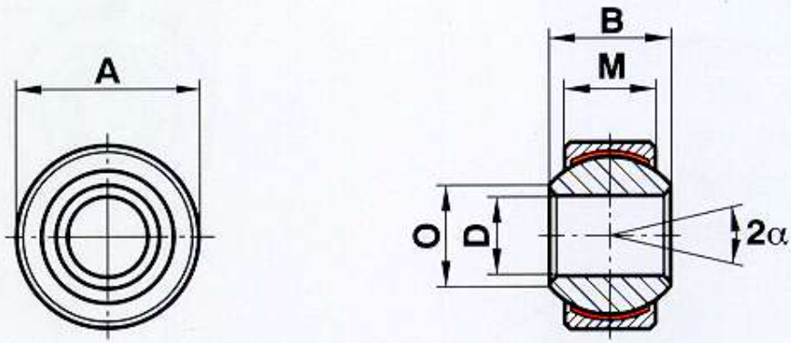 | Size (D) | D (H7) | B | M | A (h6) | O | dK | Static load C0 kN | Dynamic load C kN | Limiting speed rev/min | Pivoting angle α (o) | Weight (g) |