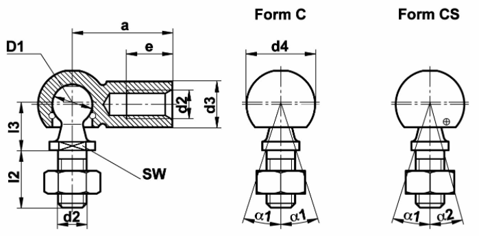 | Size (D) | a +- 0.3 | d2 | d3 +- 0.5 | d4 +- 0.5 | e min | I2 +- 0.3 | I3 +- 0.3 | SW h14 | α1 (o) | α2 (o) | Weight (g) |